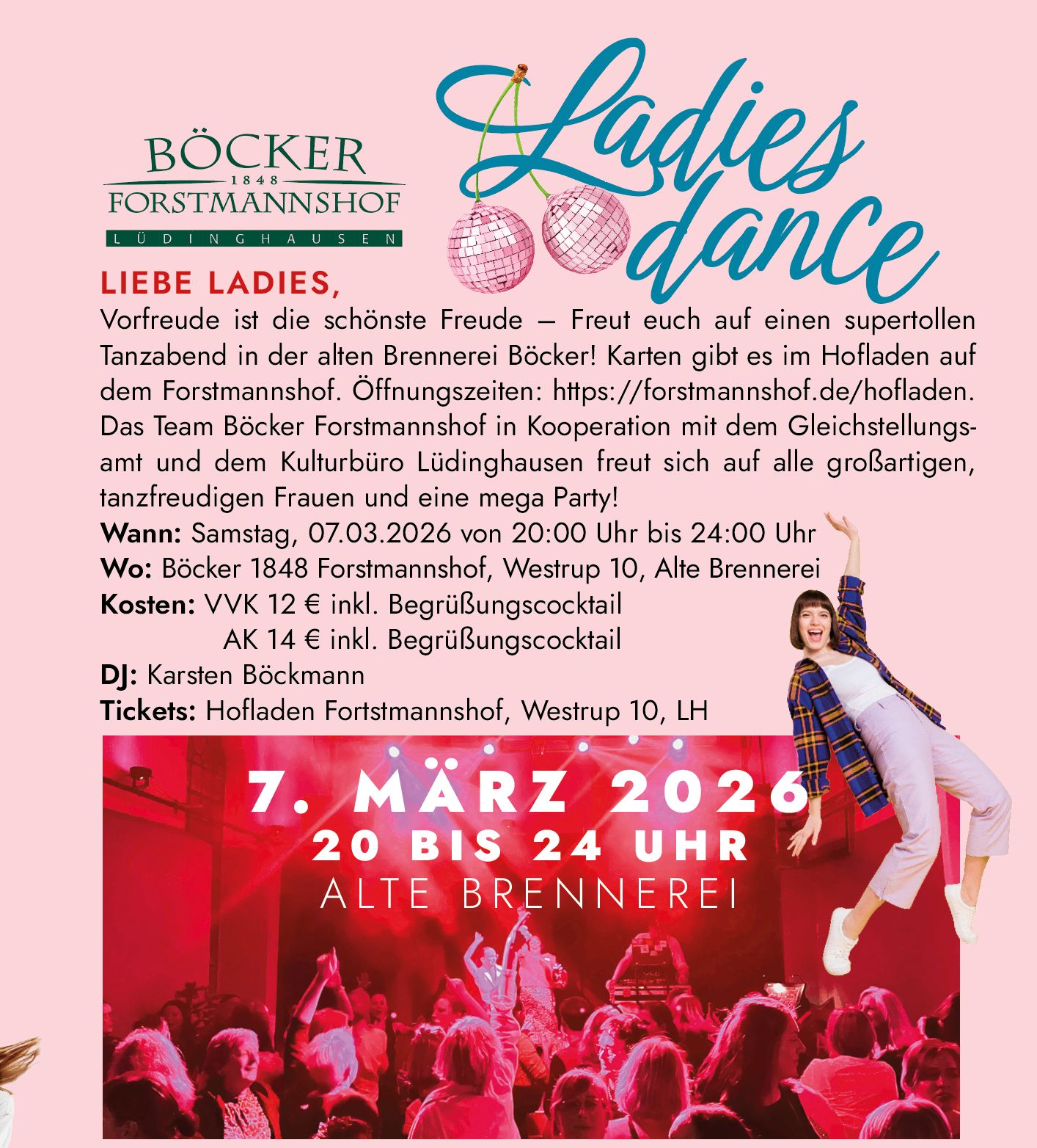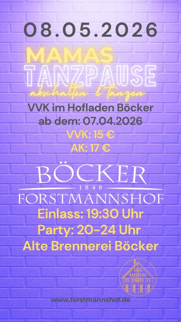 Am Freitag, den 08. Mai 2026, laden wir euch herzlich ein zu „Mamas Tanzpause – abschalten und tanzen“ in der alten Brennerei auf dem Forstmannshof in Lüdinghausen.