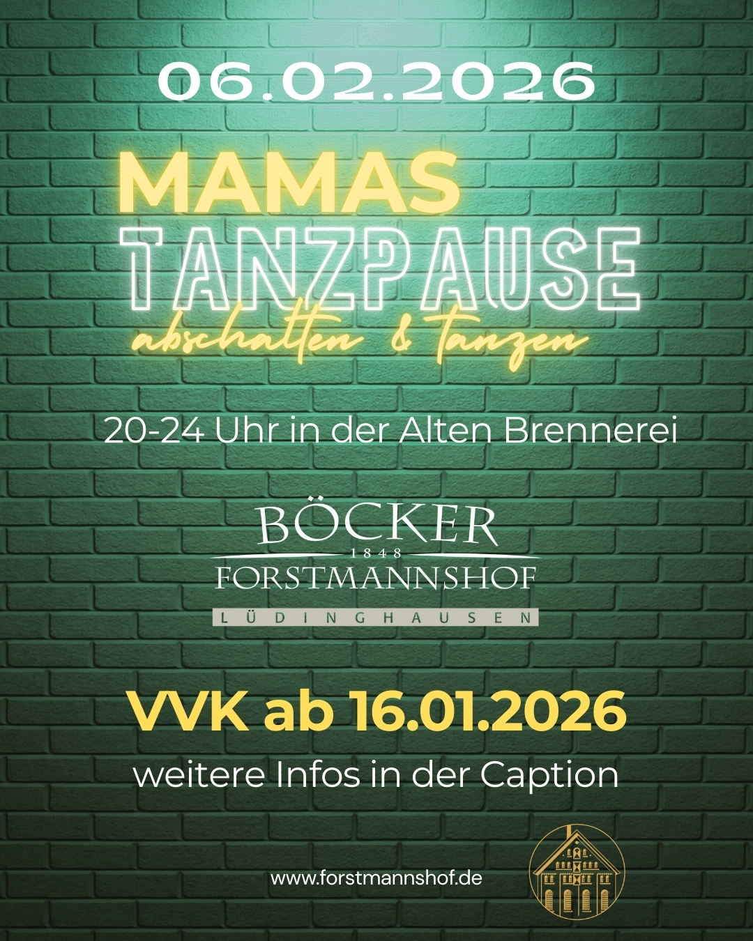 Am Freitag, den 06. Februar 2026, laden wir euch herzlich ein zu „Mamas Tanzpause – abschalten und tanzen“ in der alten Brennerei auf dem Forstmannshof in Lüdinghausen.